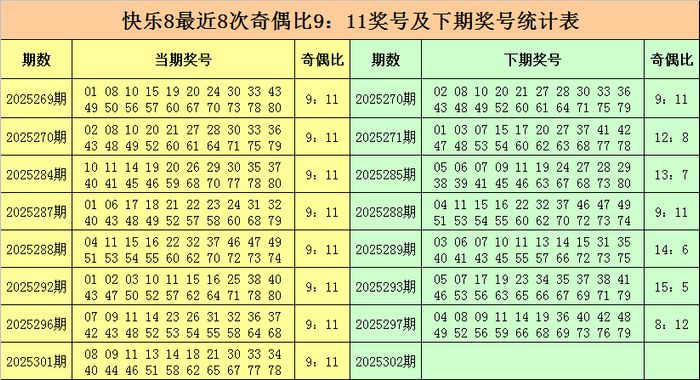 福彩痛快8第2025301期开奖纪念:08 09 11 13 14 18 21 30 33 34 40 44 46 51 58 62 65 67 77 78,其中奖号奇偶比为9:11,大小比为9:11连云港市亮多兴商贸有限公司,012路比为7:6:7。