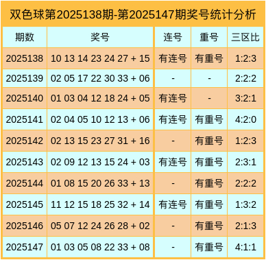 上期奖号开出1枚重号05,无连号;012路比为:2:2:2,蓝球开出2路号码08。 福彩双色球近10期数据分析统计