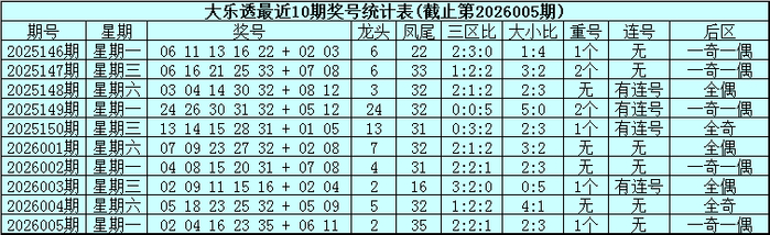 大乐透第2026005期奖号为:02、04、16、23、35+06、11。其中前区三区比为2:2:1,大小比为2:3,包含1个重号,莫得出现连号,后区为一奇一偶号码。