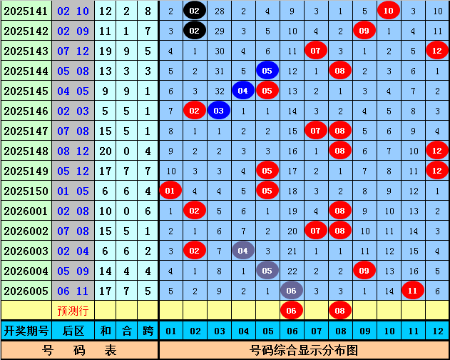 后分离析:上期后区为一奇一偶号码06+11,最近10期后区号码奇偶比为9:11,最近50期后区奇偶比为49:51,本期后区柔柔全偶组合,看好号码06、08。